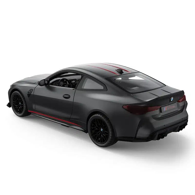 La bmw m4 rc se distingue par son design ultra-réaliste qui reprend les lignes sportives de la célèbre BMW M4 CSL noire et orange. Avec ses dimensions de 13 x 30 x 8.8 cm, elle offre une taille parfaite pour une prise en main agréable et un pilotage précis. Fabriquée en plastique solide, elle résiste bien aux petits chocs et garantit une bonne durabilité pour les longues sessions de jeu.