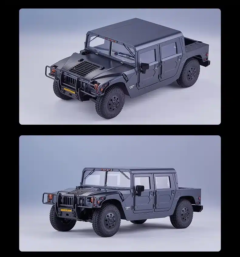 Le hummer h1 rc car arrive avec sa boîte originale, une télécommande, sa batterie lithium et les instructions d’exploitation, ce qui permet de l’utiliser dès l’ouverture du colis. Le modèle 1/12 combine pièces métal et plastique pour garder un bon équilibre entre solidité et légèreté. Son capot qui peut être basculé donne accès à l’intérieur du véhicule, entièrement pensé pour rester cohérent avec la version réelle.